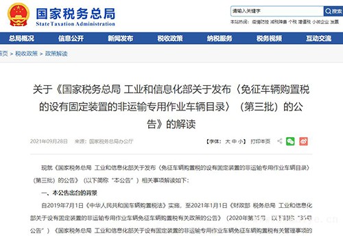現(xiàn)就《國(guó)家稅務(wù)總局 工業(yè)和信息化部關(guān)于發(fā)布〈免征車輛購(gòu)置稅的設(shè)有固定裝置的非運(yùn)輸專用作業(yè)車輛目錄〉(第三批)的公告》(以下簡(jiǎn)稱“本公告”)相關(guān)事項(xiàng)解讀如下: 一、本公告出臺(tái)的背景 自2019年7月1日《中華人民共和國(guó)車輛購(gòu)置稅法》實(shí)施,至2021年1月1日《財(cái)政部 稅務(wù)總局 工業(yè)和信息化部關(guān)于設(shè)有固定裝置的非運(yùn)輸專用作業(yè)車輛免征車輛購(gòu)置稅有關(guān)政策的公告》(2020年第35號(hào),以下簡(jiǎn)稱“35號(hào)公告”)《國(guó)家稅務(wù)總局 工業(yè)和信息化部關(guān)于設(shè)有固定裝置的非運(yùn)輸專用作業(yè)車輛免征車輛購(gòu)置稅有關(guān)管理事項(xiàng)的公告》(2020年第20號(hào),以下簡(jiǎn)稱“20號(hào)公告”)實(shí)施,稅務(wù)總局參照交通部門以往的管理模式規(guī)定,設(shè)有固定裝置的非運(yùn)輸專用作業(yè)車輛(以下簡(jiǎn)稱“專用車輛”)免征車輛購(gòu)置稅實(shí)行以下工作機(jī)制,即由相關(guān)企業(yè)通過(guò)工業(yè)和信息化部信息采集系統(tǒng),提交將車型列入《設(shè)有固定裝置的非運(yùn)輸專用作業(yè)車輛免稅圖冊(cè)》(以下簡(jiǎn)稱《免稅圖冊(cè)》)的申請(qǐng),工信部將相關(guān)信息傳遞給稅務(wù)總局,稅務(wù)總局審核編列發(fā)布《免稅圖冊(cè)》,納稅人依據(jù)《免稅圖冊(cè)》向主管稅務(wù)機(jī)關(guān)申請(qǐng)免稅。 為切實(shí)落實(shí)國(guó)務(wù)院“放管服”改革要求,優(yōu)化稅務(wù)執(zhí)法方式,提高納稅服務(wù)水平,更好地維護(hù)納稅人權(quán)益,進(jìn)一步提高專用車輛免稅管理的精確性、便捷性和及時(shí)性,35號(hào)公告和20號(hào)公告進(jìn)一步優(yōu)化專用車輛免稅管理機(jī)制,對(duì)專用車輛實(shí)行《免征車輛購(gòu)置稅的設(shè)有固定裝置的非運(yùn)輸專用作業(yè)車輛目錄》(以下簡(jiǎn)稱《目錄》)管理,車輛生產(chǎn)企業(yè)、進(jìn)口車輛經(jīng)銷商或個(gè)人(以下簡(jiǎn)稱“申請(qǐng)人”)按要求通過(guò)工信部“免征車輛購(gòu)置稅的設(shè)有固定裝置的非運(yùn)輸專用作業(yè)車輛管理系統(tǒng)”,提交將車型列入《目錄》的申請(qǐng)材料,國(guó)家稅務(wù)總局、工業(yè)和信息化部委托工業(yè)和信息化部裝備工業(yè)發(fā)展中心(以下簡(jiǎn)稱“裝備中心”)對(duì)申請(qǐng)人所提交的申請(qǐng)材料進(jìn)行技術(shù)審查。裝備中心按照《設(shè)有固定裝置的非運(yùn)輸專用作業(yè)車輛技術(shù)要求》(以下簡(jiǎn)稱《技術(shù)要求》)依規(guī)開展技術(shù)審查,并將通過(guò)審查的車型列入擬發(fā)布的《目錄》并提請(qǐng)國(guó)家稅務(wù)總局、工業(yè)和信息化部發(fā)布《目錄》。對(duì)列入《目錄》的車型,申請(qǐng)人在上傳車輛電子信息時(shí)標(biāo)注免稅標(biāo)識(shí),主管稅務(wù)機(jī)關(guān)依據(jù)車輛電子信息中標(biāo)注的免稅標(biāo)識(shí)辦理免稅事宜。 二、《目錄》涵蓋的企業(yè)和車型 包括本批《目錄》在內(nèi),2021年以來(lái)共發(fā)布了三批《目錄》。第一批《目錄》涵蓋了244家企業(yè)的3487個(gè)車型,第二批《目錄》涵蓋了303家企業(yè)的1931個(gè)車型,第三批《目錄》涵蓋了275家企業(yè)的1105個(gè)車型。三批《目錄》共涵蓋了822家企業(yè)的6523個(gè)車型。 三、車型未通過(guò)技術(shù)審查后申請(qǐng)人如何處理 (一)車型未通過(guò)技術(shù)審查的幾種情形 申請(qǐng)人通過(guò)申報(bào)系統(tǒng)提交相關(guān)資料。對(duì)不符合技術(shù)要求、材料提交不全或者填寫有誤的車型,裝備中心給予“不通過(guò)”的結(jié)論。舉例說(shuō)明: 1.甲公司申請(qǐng)將XXX型吸引壓送車列入《目錄》,該車輛額定載質(zhì)量(生產(chǎn)廠家為車輛設(shè)定的最大允許裝載質(zhì)量)12000kg�!都夹g(shù)要求》規(guī)定,額定載質(zhì)量大于或等于1000kg的專項(xiàng)作業(yè)車輛,不屬于專用車輛。 2.乙公司申請(qǐng)將進(jìn)口的XXX型機(jī)場(chǎng)用道路跑道清掃車列入《目錄》;該車輛以機(jī)場(chǎng)設(shè)備進(jìn)口,該公司未按照20號(hào)公告的要求提供車輛一致性證書等注明車輛額定載客人數(shù)、總質(zhì)量、額定載質(zhì)量等參數(shù)的材料。 3.丙公司申請(qǐng)將XXX型檢測(cè)車列入《目錄》,該公司未按照20號(hào)公告的要求,在《設(shè)有固定裝置的非運(yùn)輸專用作業(yè)車輛信息采集表》填寫該車輛額定載客人數(shù);該車輛額定載質(zhì)量小于1000kg,專用裝置在車廂地板上的投影面積小于50%,《技術(shù)要求》規(guī)定,額定載質(zhì)量小于1000kg,但車廂內(nèi)固定安裝的專用設(shè)備或者器具等固定裝置,在車廂地板上投影的面積小于車廂地板面積(不含駕駛區(qū)面積)50%的車輛(用于放置移動(dòng)專用設(shè)備或者器具的貨架投影面積不計(jì)算在內(nèi))不屬于專用車輛。 (二)車型未通過(guò)技術(shù)審查后申請(qǐng)人如何處理 第一步,若申請(qǐng)人不認(rèn)可裝備中心技術(shù)審查結(jié)論,可以通過(guò)申報(bào)系統(tǒng)隨時(shí)重新申報(bào);在重新申報(bào)時(shí),可對(duì)裝備中心技術(shù)審查結(jié)論提出自己