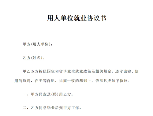 一、什么是《就業(yè)協(xié)議書》 《全國普通高等學(xué)校畢業(yè)生就業(yè)協(xié)議書》的簡稱,是普通高等學(xué)校畢業(yè)生和用人單位在正式確立勞動人事關(guān)系前,經(jīng)雙向選擇,在規(guī)定期限內(nèi)確立就業(yè)關(guān)系、明確雙方權(quán)利和義務(wù)而達(dá)成的書面協(xié)議,是用人單位確認(rèn)畢業(yè)生相關(guān)信息真實(shí)可靠以及接收畢業(yè)生的重要憑據(jù),也是高校進(jìn)行畢業(yè)生就業(yè)管理、編制就業(yè)方案以及畢業(yè)生辦理就業(yè)落戶手續(xù)等有關(guān)事項(xiàng)的重要依據(jù)。協(xié)議在畢業(yè)生到單位報(bào)到、用人單位正式接收后自行終止。就業(yè)協(xié)議一般由國家教育部或各省、市、自治區(qū)就業(yè)主管部門統(tǒng)一制表。 就業(yè)協(xié)議與勞動合同是用人單位錄用畢業(yè)生時所訂立的書面協(xié)議,但兩者分處兩個相互聯(lián)系的不同階段: 1、畢業(yè)生就業(yè)協(xié)議是畢業(yè)生在校時,由學(xué)校參與見證的,與用人單位協(xié)商簽訂的,是編制畢業(yè)生就業(yè)計(jì)劃方案和畢業(yè)生派遣的依據(jù)。勞動合同是畢業(yè)生與用人單位明確勞動關(guān)系中權(quán)利義務(wù)關(guān)系的協(xié)議,學(xué)校不是勞動合同的主體,也不是勞動合同的見證方,勞動合同是上崗畢業(yè)生從事何種崗位、享受何種待遇等權(quán)利和義務(wù)的依據(jù)。 2、畢業(yè)生就業(yè)協(xié)議的內(nèi)容主要是畢業(yè)生如實(shí)介紹自身情況,并表示愿意到用人單位就業(yè)、用人單位表示愿意接收畢業(yè)生,學(xué)校同意推薦畢業(yè)生并列入就業(yè)計(jì)劃進(jìn)行派遣。勞動合同的內(nèi)容涉及勞動報(bào)酬、勞動保護(hù)、工作內(nèi)容、勞動紀(jì)律等方方面面,更為具體.勞動權(quán)利義務(wù)更為明確。 3、一般來說就業(yè)協(xié)議簽訂在前,勞動合同訂立在后,如果畢業(yè)生與用人單位就工資待遇、住房等有事先約定,亦可在就業(yè)協(xié)議備注條款中予以注明,日后訂立勞動合同對此內(nèi)容應(yīng)予認(rèn)可。 4、就業(yè)協(xié)議是畢業(yè)生和用人單位關(guān)于將來就業(yè)意向的初步約定,對于雙方的基本條件以及即將簽訂勞動合同的部分基本內(nèi)容大體認(rèn)可,并經(jīng)用人單位的上級主管部門,高校畢業(yè)生和用人單位簽字蓋章承諾履行協(xié)議,高校不作為第三方。高校只在“有關(guān)信息及意見”一欄填寫(或制作長條章加蓋)學(xué)校的聯(lián)系電話、郵箱、郵寄地址及相關(guān)意見等信息。一經(jīng)畢業(yè)生、用人單位、高校、用人單位主管部門簽字蓋章,即具有一定的法律效應(yīng),是編制畢業(yè)生的就業(yè)計(jì)劃和將來可能發(fā)生違約情況時的判斷依據(jù)。 5、現(xiàn)實(shí)中就業(yè)協(xié)議存在的尷尬現(xiàn)象,必須先簽訂就業(yè)協(xié)議,學(xué)校才發(fā)畢業(yè)證的現(xiàn)象(不簽三方,不發(fā)畢業(yè)證)。這樣,就業(yè)協(xié)議不是畢業(yè)生和用人單位關(guān)于將來就業(yè)意向的初步約定,而是未畢業(yè)生和用人單位關(guān)于將來就業(yè)意向的初步約定。 二、就業(yè)協(xié)議的主要內(nèi)容 (一)《就業(yè)協(xié)議書》的基本內(nèi)容 (1)高校畢業(yè)生基本情況,應(yīng)包括:姓名、性別、身份證號、專業(yè)、學(xué)制、畢業(yè)時間、學(xué)歷、聯(lián)系方式等。 (2)用人單位基本情況,應(yīng)包括:單位名稱、組織機(jī)構(gòu)代碼、單位性質(zhì)、聯(lián)系人及聯(lián)系方式、檔案接收地等。 (3)高校畢業(yè)生和用人單位約定的有關(guān)內(nèi)容,可包括:工作地點(diǎn)及工作崗位;戶口遷入地;違約責(zé)任;協(xié)議自動失效條款、協(xié)議終止條款;雙方約定的其他事宜。 (4)各方應(yīng)嚴(yán)格履行協(xié)議,任何一方若違反協(xié)議,應(yīng)承擔(dān)違約責(zé)任。 (5)其他補(bǔ)充協(xié)議。 (二)就業(yè)協(xié)議協(xié)議包括 由甲方(用人單位)和乙方(高校畢業(yè)生),同意簽訂如下協(xié)議: (1) 甲方應(yīng)如實(shí)向乙方介紹情況,經(jīng)了解,同意接受乙方,并負(fù)責(zé)有關(guān)接受手續(xù)。 (2) 乙方應(yīng)如實(shí)向甲方介紹情況,同意到甲方工作,服從甲方的工作安排。 (4)甲乙雙方如有其他約定,應(yīng)在備注欄明確,并視為本協(xié)議書的一部分。 (5)雙方中有一方要變動協(xié)議,須提前一個月征得對方的同意,否則按違約處理。 (6)本協(xié)議一式三份,分別由甲方、乙方和學(xué)校就業(yè)工作部門留存,復(fù)印件無效。 (7)就業(yè)協(xié)議書由各省級高校畢業(yè)生就業(yè)工作主管部門或高等學(xué)校印制,由高等學(xué)校統(tǒng)一發(fā)放給畢業(yè)生。 三、就業(yè)協(xié)議的注意事項(xiàng) 須注意的是學(xué)校同意蓋章這一步一定要最后執(zhí)行以保護(hù)學(xué)生的權(quán)益高校畢業(yè)生就業(yè)必須由畢業(yè)生、用人單位和學(xué)校簽署就業(yè)協(xié)議書。就業(yè)協(xié)議書一式三份,畢業(yè)生、用人單位和學(xué)校各執(zhí)一份。就業(yè)協(xié)議書由國家或市高校畢業(yè)生就業(yè)主管部門統(tǒng)一制表。 (一)畢業(yè)生 和用人單位在就業(yè)協(xié)議書上簽名蓋章。 (二)用人單位上級主管部門批準(