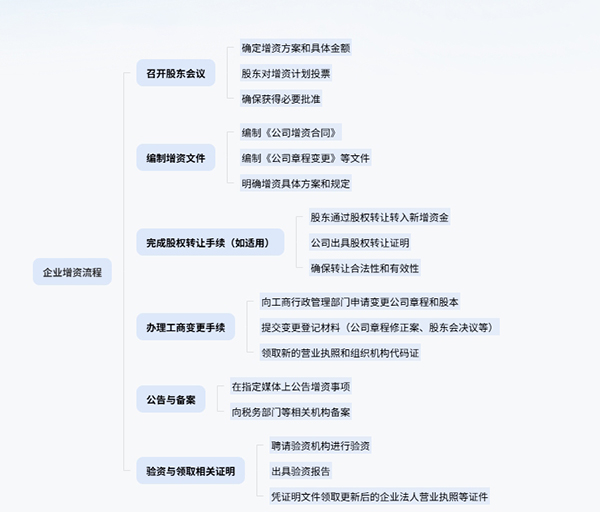 企業(yè)增資流程一般包括以下六個步驟: 一、召開股東會議 首先,公司需要召開股東會議,確定增資的方案和具體金額。在這一步驟中,股東將對增資計劃進(jìn)行投票,并確保獲得必要的批準(zhǔn)。 二、編制增資文件 在股東會議通過后,公司需要編制相關(guān)的增資文件,如《公司增資合同》和《公司章程變更》等。這些文件將明確增資的具體方案和規(guī)定,為后續(xù)的增資操作提供依據(jù)。 三、完成股權(quán)轉(zhuǎn)讓手續(xù)(如適用) 如果增資是通過股權(quán)轉(zhuǎn)讓的形式進(jìn)行,那么股東需要將新增的資金通過股權(quán)轉(zhuǎn)讓轉(zhuǎn)入公司賬戶。在這一步驟中,公司應(yīng)出具相關(guān)的股權(quán)轉(zhuǎn)讓證明,以確保轉(zhuǎn)讓的合法性和有效性。 四、辦理工商變更手續(xù) 完成上述步驟后,公司需要向當(dāng)?shù)毓ど绦姓芾聿块T申請變更公司章程和股本。這一步驟包括提交必要的變更登記材料,如公司章程修正案、股東會決議等,并領(lǐng)取新的營業(yè)執(zhí)照和組織機構(gòu)代碼證。 五、公告與備案 公司應(yīng)按照要求在指定媒體上公告增資事項,以便公眾了解公司的最新資本情況。同時,公司還需向稅務(wù)部門等相關(guān)機構(gòu)進(jìn)行備案,確保增資的合規(guī)性。 六、驗資與領(lǐng)取相關(guān)證明 最后,公司需要聘請具有法定資格的驗資機構(gòu)對增資進(jìn)行驗資,并出具驗資報告。驗資完成后,公司可憑借相關(guān)證明文件到工商部門領(lǐng)取更新后的企業(yè)法人營業(yè)執(zhí)照等證件。 請注意,以上流程可能因地區(qū)和行業(yè)而有所不同,建議在進(jìn)行增資前咨詢相關(guān)專業(yè)人士的意見,以確保辦理流程的準(zhǔn)確性和順利性。 |