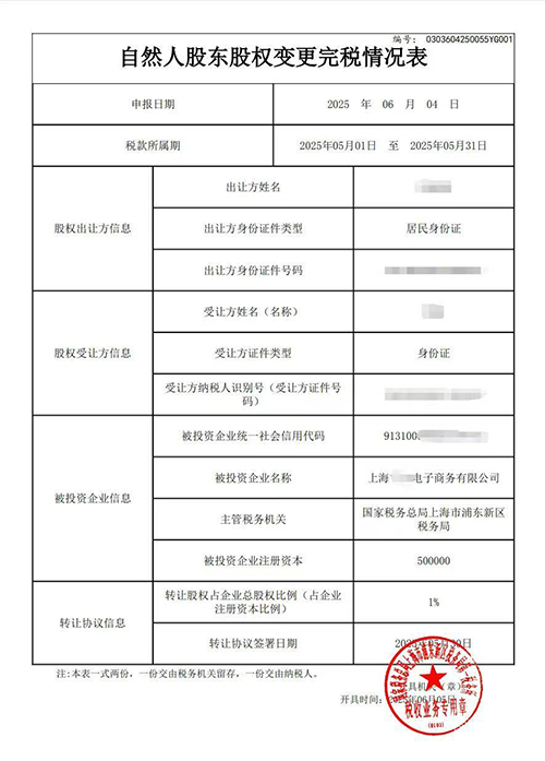 - 向主管稅務機關(guān)提交《個人所得稅自行納稅申報表》及股權(quán)轉(zhuǎn)讓合同等材料。