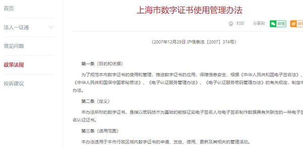 上海市數(shù)字證書使用管理辦法 第一條(目的和依據(jù)) 為了規(guī)范本市數(shù)字證書的使用和管理,推進數(shù)字證書的應用,保障信息安全,根據(jù)《中華人民共和國電子簽名法》、《中華人民共和國保守國家秘密法》、《電子認證服務管理辦法》、《電子認證服務密碼管理辦法》的有關規(guī)定,制定本辦法。 第二條(定義) 本辦法所稱的數(shù)字證書,是指以密碼技術為基礎的能夠證實電子簽名人與電子簽名制作數(shù)據(jù)具有關聯(lián)性的一種電子簽名認證證書。 第三條(適用范圍) 本辦法適用于本市行政區(qū)域內數(shù)字證書的申請、發(fā)放、使用、更新及其相關的管理活動。 第四條(管理部門) 上海市信息化委員會(以下簡稱市信息委)、上海市國家密碼管理委員會辦公室(以下簡稱市國密辦)、上海市國家保密局(以下簡稱市國家保密局)按照各自職責,負責本市數(shù)字證書使用的統(tǒng)一規(guī)劃和管理。 第五條(電子認證服務) 本市電子政務活動中涉及數(shù)字證書使用的電子認證服務,應當由依法設立并經(jīng)市信息委、市國密辦、市國家保密局共同認可的電子認證服務機構統(tǒng)一提供,其系統(tǒng)建設應當符合本市統(tǒng)一的電子認證服務體系的建設要求。 本市社會公共服務活動中涉及數(shù)字證書使用的電子認證服務,應當由依法設立的電子認證服務機構提供,其系統(tǒng)建設應當符合本市統(tǒng)一的電子認證服務體系的建設要求。 本市電子商務活動中涉及數(shù)字證書使用的電子認證服務,應當由依法設立的電子認證服務機構提供。 第六條(數(shù)字證書在電子政務活動中的使用) 在下列電子政務活動中,需要解決身份認證、授權管理、責任認定的,應當按照國家和本市有關規(guī)定使用數(shù)字證書: (一)利用電子政務系統(tǒng)開展內部辦公或者協(xié)同辦公、公文流轉、公文歸檔以及歸檔公文向檔案館移交等活動; (二)網(wǎng)上政府采購、招投標等活動; (三)網(wǎng)上申報、年檢、備案、審批、繳費、資質認定、統(tǒng)計等社會管理活動; (四)利用網(wǎng)絡向社會提供信息公開服務的活動; (五)其他利用網(wǎng)絡開展電子政務的活動。 第七條(數(shù)字證書在社會公共服務活動中的使用) 在下列社會公共服務活動中,需要解決身份認證、授權管理、責任認定的,應當按照國家和本市有關規(guī)定使用數(shù)字證書: (一)法律、法規(guī)授權的具有管理公共事務職能的組織利用網(wǎng)絡開展的社會公共服務活動; (二)銀行、證券、保險、期貨等行業(yè)的機構利用網(wǎng)絡開展的金融服務活動; (三)教育、醫(yī)療衛(wèi)生、供水、供電、供氣、供熱、公共交通、環(huán)保等領域的企事業(yè)單位,利用網(wǎng)絡開展的社會公共服務活動; (四)其他利用網(wǎng)絡開展的社會公共服務活動。 第八條(數(shù)字證書在電子商務活動中的使用) 在下列電子商務活動中,需要解決身份認證、授權管理、責任認定的,鼓勵使用數(shù)字證書: (一)設立各類網(wǎng)絡交易平臺、信息服務平臺和娛樂平臺的活動; (二)利用網(wǎng)絡簽訂電子合同、進行電子支付、交付數(shù)字產(chǎn)品的活動; (三)電子商務活動中交易各方認為需要使用數(shù)字證書的活動; (四)其他利用網(wǎng)絡開展的電子商務活動。 第九條(數(shù)字證書的申請和發(fā)放) 申請使用數(shù)字證書的政府機構、法律法規(guī)授權的具有管理公共事務職能的組織、企事業(yè)單位、民辦非企業(yè)單位(以下簡稱單位)或者個人,應當向電子認證服務機構 提供合法、有效的證件或者證明材料。經(jīng)審查符合申請條件的,雙方簽訂數(shù)字證書使用服務協(xié)議,由電子認證服務機構發(fā)放數(shù)字證書并收取相關費用。 因開展電子政務活動或者社會公共服務活動申請數(shù)字證書的,應當由單位集中辦理。 第十條(數(shù)字證書的更新、掛失、撤銷及服務協(xié)議示范文本) 數(shù)字證書的更新、掛失、撤銷等事項和各方的權利義務,由數(shù)字證書使用服務協(xié)議予以約定。 市信息委會同市國密辦、市國家保密局組織制訂和發(fā)布數(shù)字證書服務協(xié)議示范文本,供協(xié)議各方參照使用。 第十一條(數(shù)字證書的收費標準) 用于電子政務和社會公共服務活動的數(shù)字證書的收費標準,應當經(jīng)市價格主管部門會同有關部門批準。 用于電子商務活動的數(shù)字證書的收費標準,由電子認證服務機構明碼標示或者由數(shù)字證書使用服務協(xié)議約定。 第十二條(數(shù)字證書持有人的使用保管義務) 數(shù)字證書應當保存在符合國家密碼管理相關規(guī)定的載體中。數(shù)字證書持有人應當妥善保管數(shù)字證書及其密鑰,未經(jīng)明確授權,不得隨意轉借他人使用。 單位需要使用2個及2個以上數(shù)字證書的,應當建立內部規(guī)章制度,明確數(shù)字證書的實際保管人、使用權限、用途、登記、發(fā)放等內容。 第十三條(數(shù)字證書的相關信息保密) 電子認證服務機構應當按照《中華人民共和國保守國家秘密法》、《電子認證服務管理辦法》等的規(guī)定,建立完善的保密制度,履行保密義務,并接受有關職能部門的監(jiān)督指導。 除法律法規(guī)另有規(guī)定外,電子認證服務機構及其工作人員不