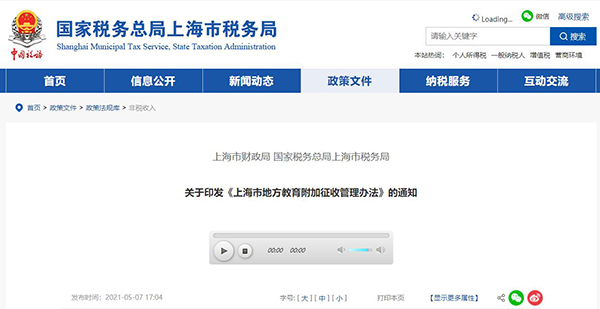 各區(qū)財政局、市財政監(jiān)督局,國家稅務(wù)總局上海市各區(qū)稅務(wù)局、各稅務(wù)分局、各稽查局: 根據(jù)《上海市人民政府關(guān)于本市繼續(xù)征收地方教育附加的通知》(滬府規(guī)〔2020〕35號)規(guī)定,為加強和規(guī)范地方教育附加的征收管理,我們制定了《上海市地方教育附加征收管理辦法》,現(xiàn)印發(fā)給你們,請按照執(zhí)行。 上海市財政局 國家稅務(wù)總局上海市稅務(wù)局 2021年4月28日 上海市地方教育附加征收管理辦法 第一條 為貫徹落實《中華人民共和國教育法》、《財政部關(guān)于同意上海市開征地方教育附加的復(fù)函》(財綜函〔2010〕78號)以及《上海市人民政府關(guān)于本市繼續(xù)征收地方教育附加的通知》(滬府規(guī)〔2020〕35號)有關(guān)精神,制定本辦法。 第二條 凡在本市行政區(qū)域內(nèi)繳納增值稅、消費稅的單位和個人(包括外商投資企業(yè)、外國企業(yè)及外籍個人),除按國家規(guī)定繳納教育費附加外,應(yīng)當(dāng)按本辦法規(guī)定繳納地方教育附加。 第三條 地方教育附加以單位和個人實際繳納的增值稅、消費稅稅額為計征依據(jù),征收率為2%。地方教育附加的減免優(yōu)惠政策,按國家有關(guān)文件規(guī)定執(zhí)行。 第四條 地方教育附加由本市稅務(wù)部門負責(zé)征收,征收時應(yīng)使用稅務(wù)部門統(tǒng)一印制的稅收票證,并按國家和本市非稅收入收繳管理有關(guān)規(guī)定將收入及時、足額繳入市級國庫。 第五條 地方教育附加屬于政府性基金項目,納入財政預(yù)算,實行“收支兩條線”管理。 第六條 納稅人應(yīng)當(dāng)在繳納增值稅、消費稅時一并繳納地方教育附加。單位繳納的地方教育附加,按照國家統(tǒng)一規(guī)定的會計制度處理。 第七條 各級財政、稅務(wù)、人力資源社會保障、教育、審計等部門要加強對地方教育附加的征收、解繳、使用的監(jiān)督管理和檢查。 第八條 凡未經(jīng)批準,擅自多征、減征、緩征、停征,或者侵占、截留、挪用地方教育附加的,要依照《財政違法行為處罰處分條例》(國務(wù)院令第427號)和《違反行政事業(yè)性收費和罰沒收入收支兩條線管理規(guī)定行政處分暫行規(guī)定》(國務(wù)院令第281號)追究責(zé)任人的行政責(zé)任;構(gòu)成犯罪的,依法追究刑事責(zé)任。 第九條 本辦法自2021年5月1日起施行,2021年1月1日至2021年4月30日期間征收管理的相關(guān)事宜參照本辦法執(zhí)行。 第十條 本辦法由市財政局、市稅務(wù)局按照各自職責(zé)負責(zé)解釋。 |