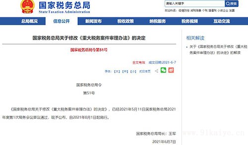 重大稅務(wù)案件審理辦法 (2014年12月2日國家稅務(wù)總局令第34號公布,根據(jù)2021年6月7日國家稅務(wù)總局令第51號修正) 第一章 總則 第一條 為貫徹落實中共中央辦公廳、國務(wù)院辦公廳印發(fā)的《關(guān)于進(jìn)一步深化稅收征管改革的意見》,推進(jìn)稅務(wù)機(jī)關(guān)科學(xué)民主決策,強(qiáng)化內(nèi)部權(quán)力制約,優(yōu)化稅務(wù)執(zhí)法方式,嚴(yán)格規(guī)范執(zhí)法行為,推進(jìn)科學(xué)精確執(zhí)法,保護(hù)納稅人繳費人等稅務(wù)行政相對人合法權(quán)益,根據(jù)《中華人民共和國行政處罰法》《中華人民共和國稅收征收管理法》,制定本辦法。 第二條 省以下各級稅務(wù)局開展重大稅務(wù)案件審理工作適用本辦法。 第三條 重大稅務(wù)案件審理應(yīng)當(dāng)以事實為根據(jù)、以法律為準(zhǔn)繩,遵循合法、合理、公平、公正、效率的原則,注重法律效果和社會效果相統(tǒng)一。 第四條 參與重大稅務(wù)案件審理的人員應(yīng)當(dāng)嚴(yán)格遵守國家保密規(guī)定和工作紀(jì)律,依法為納稅人繳費人等稅務(wù)行政相對人的商業(yè)秘密、個人隱私和個人信息保密。 第二章 審理機(jī)構(gòu)和職責(zé) 第五條 省以下各級稅務(wù)局設(shè)立重大稅務(wù)案件審理委員會(以下簡稱審理委員會)。 審理委員會由主任、副主任和成員單位組成,實行主任負(fù)責(zé)制。 審理委員會主任由稅務(wù)局局長擔(dān)任,副主任由稅務(wù)局其他領(lǐng)導(dǎo)擔(dān)任。審理委員會成員單位包括政策法規(guī)、稅政業(yè)務(wù)、納稅服務(wù)、征管科技、大企業(yè)稅收管理、稅務(wù)稽查、督察內(nèi)審部門。各級稅務(wù)局可以根據(jù)實際需要,增加其他與案件審理有關(guān)的部門作為成員單位。 第六條 審理委員會履行下列職責(zé): (一)擬定本機(jī)關(guān)審理委員會工作規(guī)程、議事規(guī)則等制度; (二)審理重大稅務(wù)案件; (三)指導(dǎo)監(jiān)督下級稅務(wù)局重大稅務(wù)案件審理工作。 第七條 審理委員會下設(shè)辦公室,辦公室設(shè)在政策法規(guī)部門,辦公室主任由政策法規(guī)部門負(fù)責(zé)人兼任。 第八條審理委員會辦公室履行下列職責(zé): (一)組織實施重大稅務(wù)案件審理工作; (二)提出初審意見; (三)制作審理會議紀(jì)要和審理意見書; (四)辦理重大稅務(wù)案件審理工作的統(tǒng)計、報告、案卷歸檔; (五)承擔(dān)審理委員會交辦的其他工作。 第九條 審理委員會成員單位根據(jù)部門職責(zé)參加案件審理,提出審理意見。 稽查局負(fù)責(zé)提交重大稅務(wù)案件證據(jù)材料、擬作稅務(wù)處理處罰意見、舉行聽證。 稽查局對其提交的案件材料的真實性、合法性、準(zhǔn)確性負(fù)責(zé)。 第十條 參與重大稅務(wù)案件審理的人員有法律法規(guī)規(guī)定的回避情形的,應(yīng)當(dāng)回避。 重大稅務(wù)案件審理參與人員的回避,由其所在部門的負(fù)責(zé)人決定;審理委員會成員單位負(fù)責(zé)人的回避,由審理委員會主任或其授權(quán)的副主任決定。 第三章 審理范圍 第十一條 本辦法所稱重大稅務(wù)案件包括: (一)重大稅務(wù)行政處罰案件,具體標(biāo)準(zhǔn)由各省、自治區(qū)、直轄市和計劃單列市稅務(wù)局根據(jù)本地情況自行制定,報國家稅務(wù)總局備案; (二)根據(jù)《重大稅收違法案件督辦管理暫行辦法》督辦的案件; (三)應(yīng)監(jiān)察、司法機(jī)關(guān)要求出具認(rèn)定意見的案件; (四)擬移送公安機(jī)關(guān)處理的案件; (五)審理委員會成員單位認(rèn)為案情重大、復(fù)雜,需要審理的案件; (六)其他需要審理委員會審理的案件。 有下列情形之一的案件,不屬于重大稅務(wù)案件審理范圍: (一)公安機(jī)關(guān)已就稅收違法行為立案的; (二)公安機(jī)關(guān)尚未就稅收違法行為立案,但被查對象為走逃(失聯(lián))企業(yè),并且涉嫌犯罪的; (三)國家稅務(wù)總局規(guī)定的其他情形。 第十二條 本辦法第十一條第一款第三項規(guī)定的案件經(jīng)審理委員會審理后,應(yīng)當(dāng)將擬處理意見報上一級稅務(wù)局審理委員會備案。備案5日后可以作出決定。 第十三條 稽查局應(yīng)當(dāng)在每季度終了后5日內(nèi)將稽查案件審理情況備案表送審理委員會辦公室備案。 第四章 提請和受理 第十四條 稽查局應(yīng)當(dāng)在內(nèi)部審理程序終結(jié)后5日內(nèi),將重大稅務(wù)案件提請審理委員會審理。 當(dāng)事人按照法律、法規(guī)、規(guī)章有關(guān)規(guī)定要求聽證的,由稽查局組織聽證。 第十五條 稽查局提請審理委員會審理案件,應(yīng)當(dāng)提交以下案件材料: (一)重大稅務(wù)案件審理案卷交接單; (二)重大稅務(wù)案件審理提請書; (三)稅務(wù)稽查報告; (四)稅務(wù)稽查審理報告; (五)聽證材料; (六)相關(guān)證據(jù)材料。 重大稅務(wù)案件審理提請書應(yīng)當(dāng)寫明擬處理意見,所認(rèn)定的案件事實應(yīng)當(dāng)標(biāo)明證據(jù)指向。 證據(jù)材料應(yīng)當(dāng)制作證據(jù)目錄。 稽查局應(yīng)當(dāng)完整移交證據(jù)目錄所列全部證據(jù)材料,不能當(dāng)場移交的應(yīng)當(dāng)注明存放地點。 第十六條 審理委員會辦公室收到稽查局提請審理的案件材料后,應(yīng